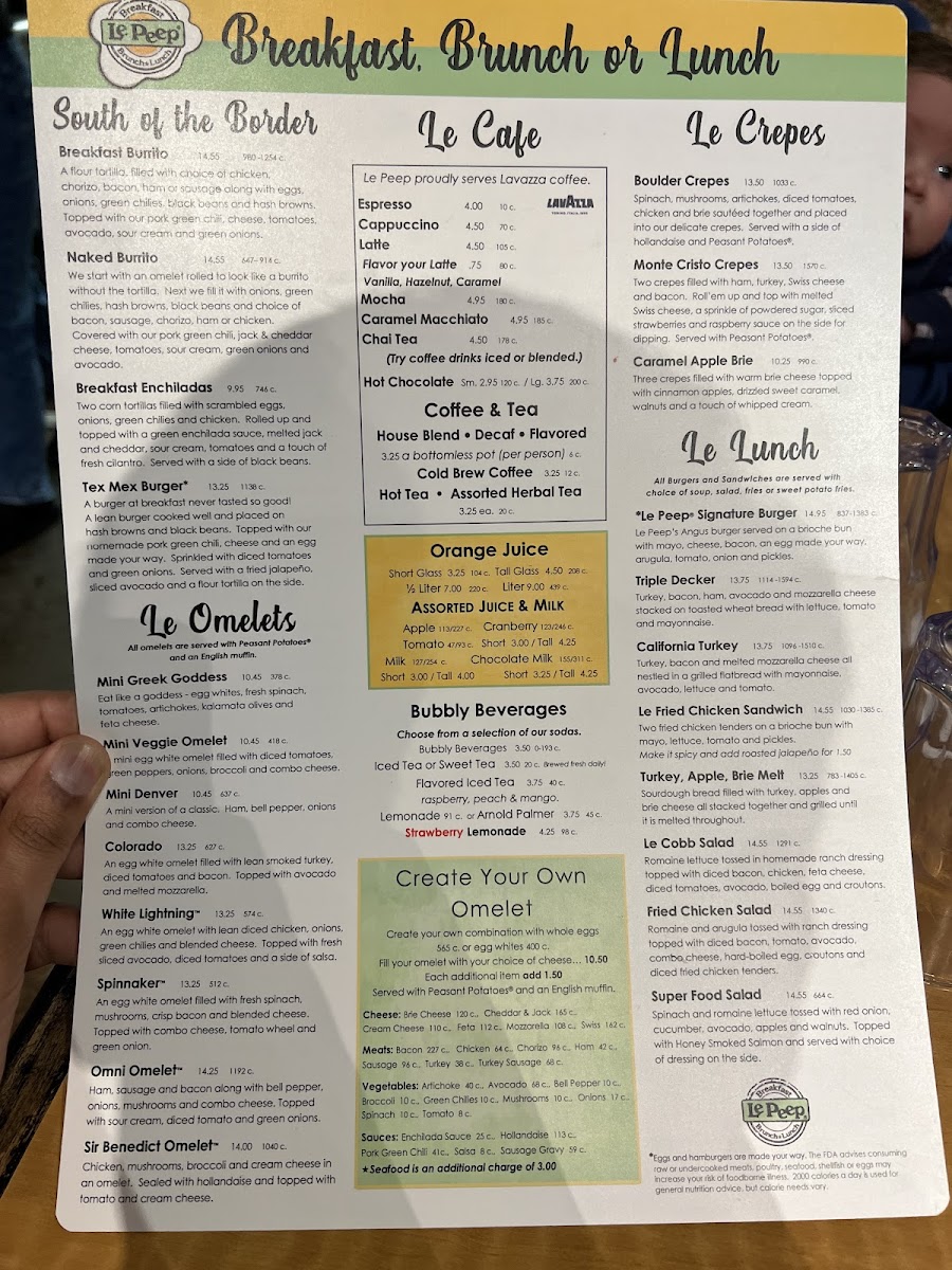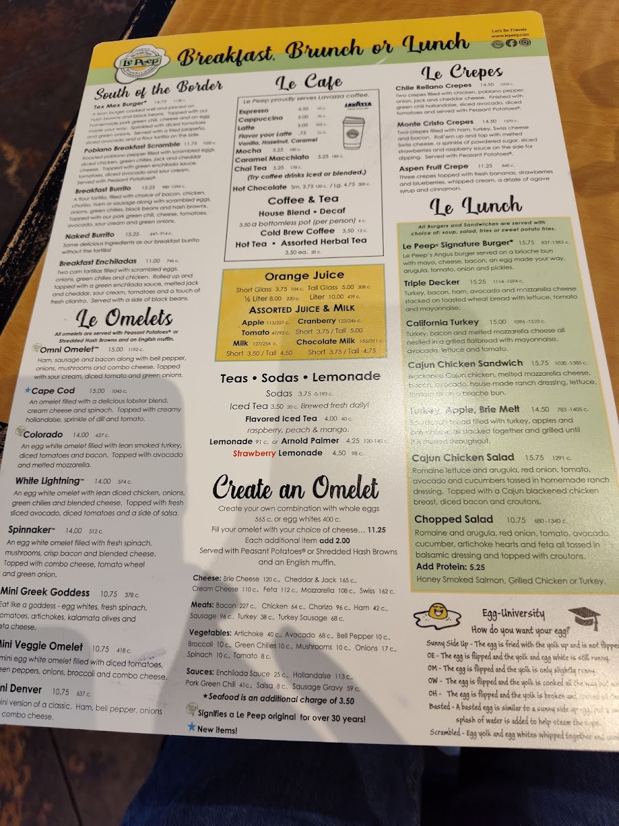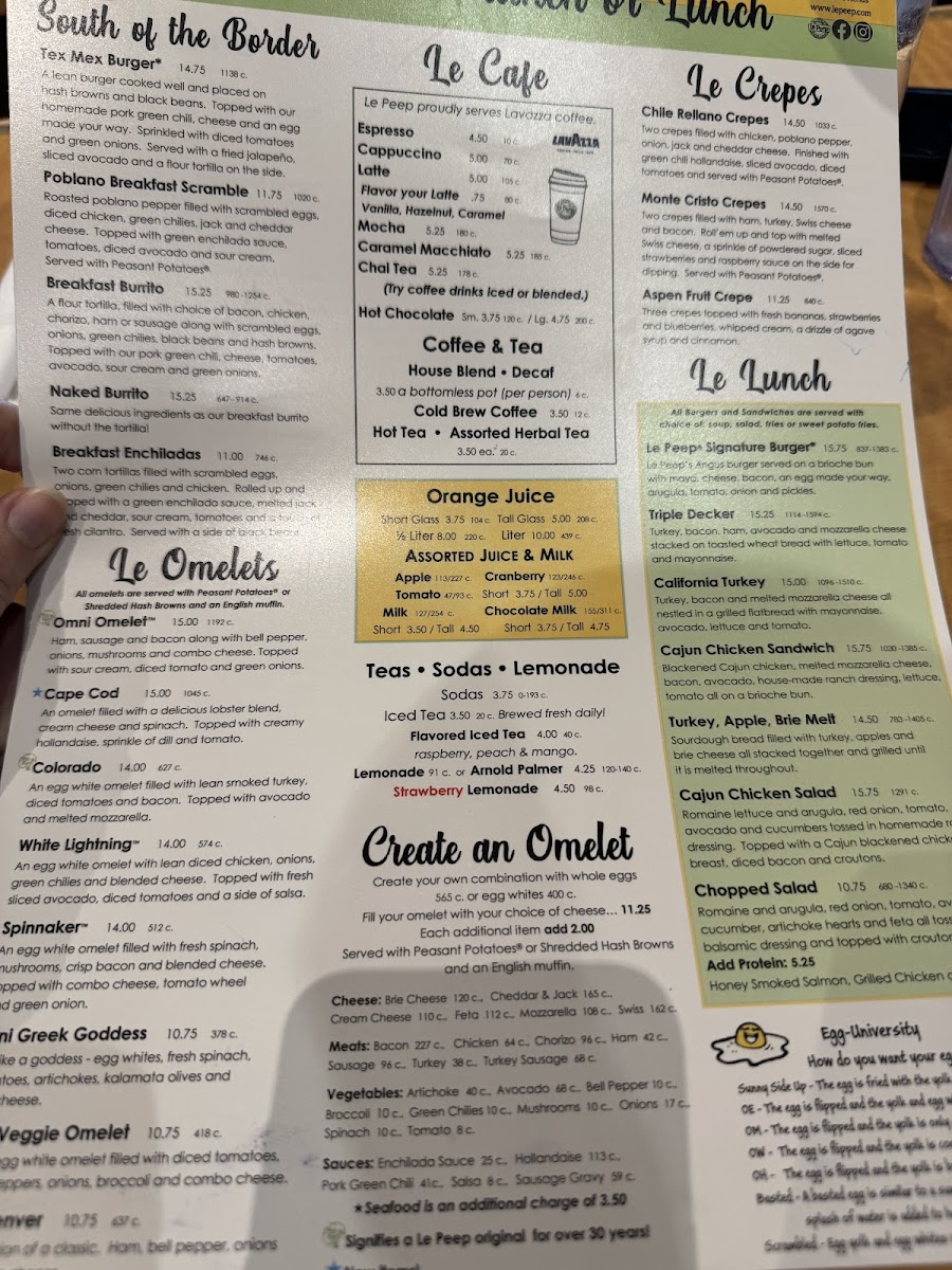 Ham, sausage and bacon, green peppers, onions, mushrooms, combo cheese and sour cream and chives. A le peep® creation.