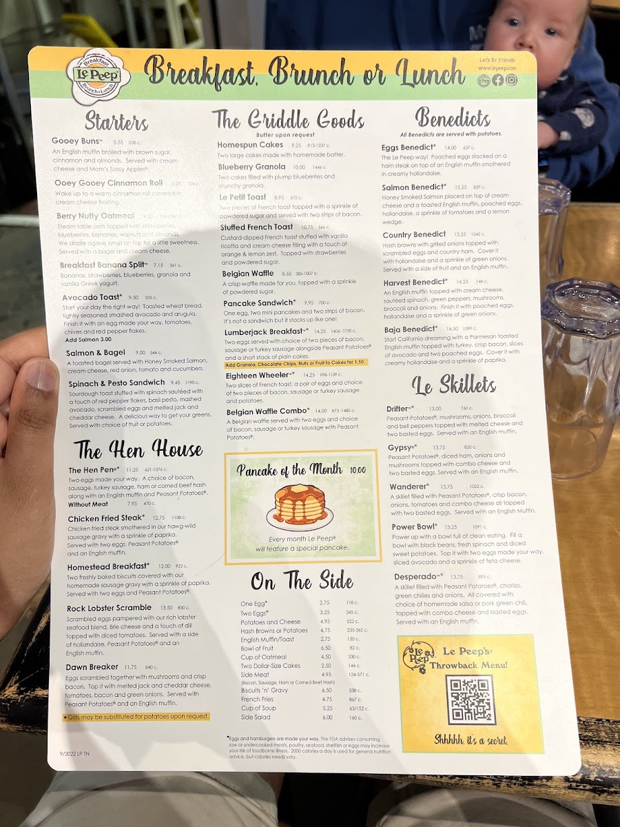 1 farm fresh egg, 2 mini pancakes and 2 strips of bacon, served with whipped butter and syrup.